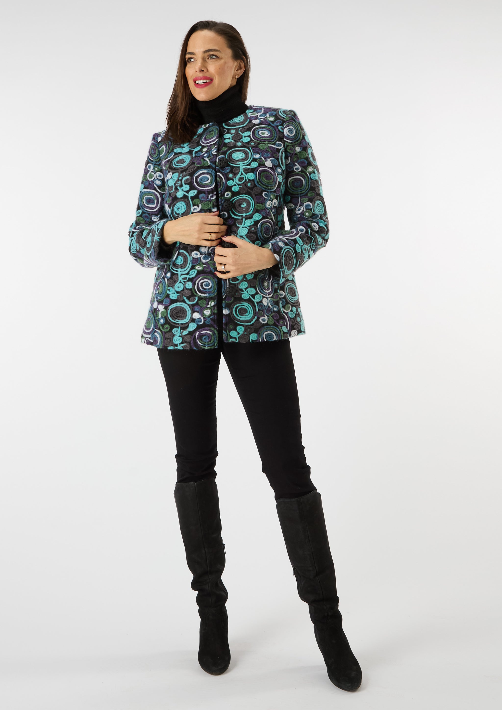 Ideal for both day and evening wear, this jacket complements tailored trousers or a sleek skirt for a polished appearance. It features a round neckline, practical side pockets, and a straight cut that creates an elegant silhouette. This semi-fitted jacket is hip-length, lightly padded, and fully lined.